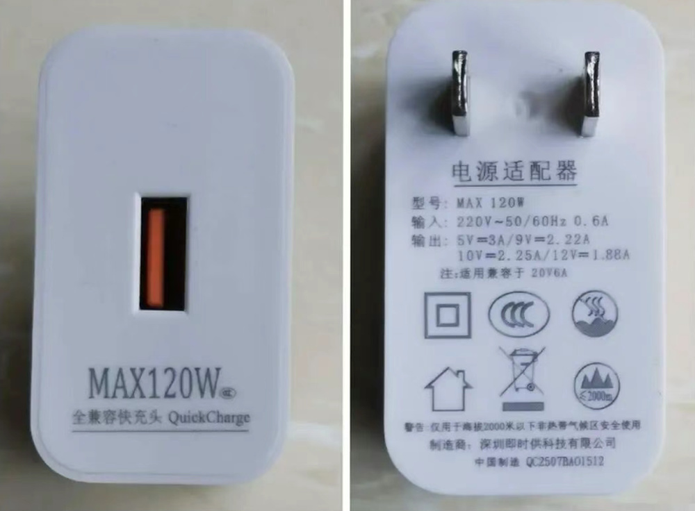 一款写有“120W”的快充头,实际最大输出功率只有22.5W。图片来源:封面新闻