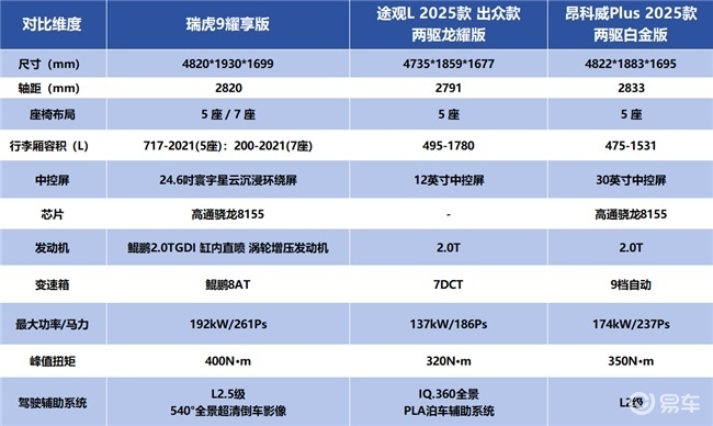 在智能化、舒适性配置成为购车核心需求的当下,三款车型的配置差异也很明显。瑞虎9耀享版综合表现更全面,昂科威Plus侧重科技感但实用配置不足,途观L则主打务实保守。下面来具体看看: